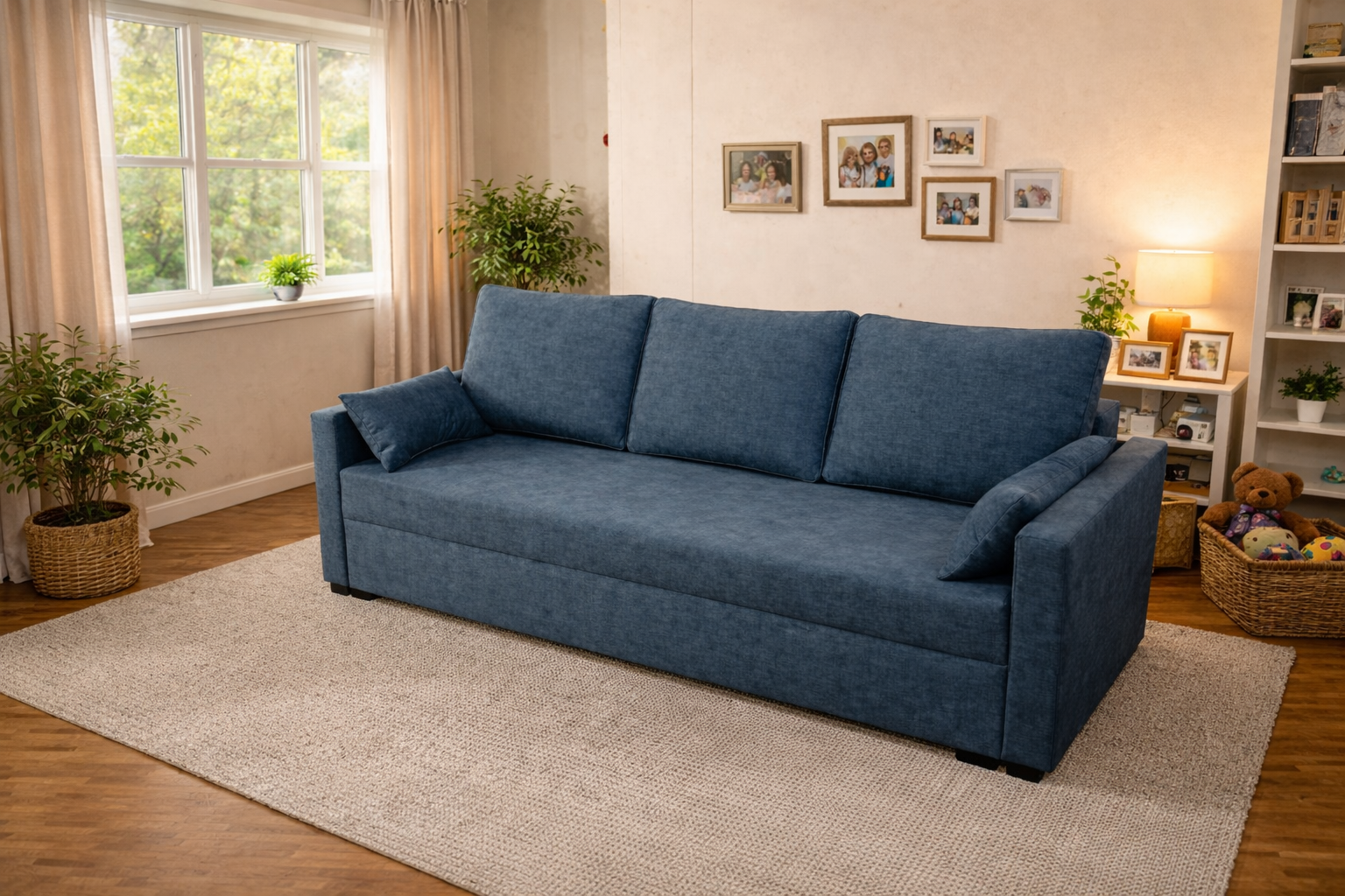 W podstawowej wersji ten projekt to kwintesencja elegancji i wygody. Głęboki, niebieski kolor tapicerki nadaje wnętrzu charakteru, a prosta bryła sprawia, że mebel pasuje zarówno do stylu skandynawskiego, jak i nowoczesnego.