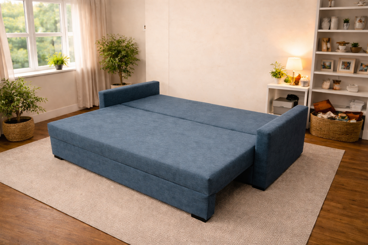 Po całkowitym rozłożeniu i zdjęciu poduch oparciowych, sofa zamienia się w pełnowymiarowe miejsce do spania. Otrzymujemy dużą, płaską i – co najważniejsze – równą powierzchnię.